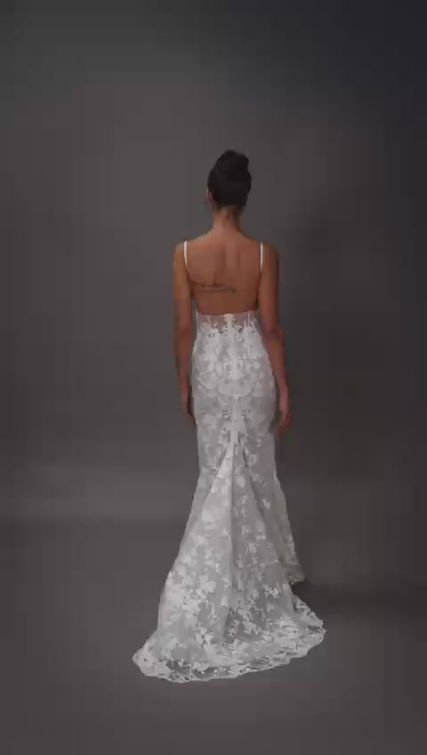 Lace gown with silk charmeuse straps, built in low back corset and dramatic back train. Invisible zip closure at the centre back. Gown offers 3 different options: available with matching peplum over skirt and matching jacket.