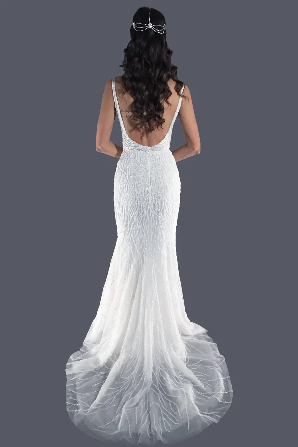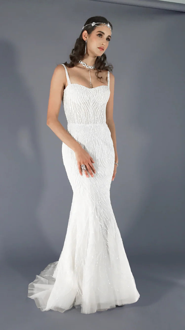 A glamorous fit and flare hand beaded gown featured a built in corset with straps and low cut back, skirt lined with silk chiffon lining and soft tulle layers for a luxurious feel. Invisible zip skirt back closure and tree covered satin buttons at the centre back of the corset gives a true couture touch.